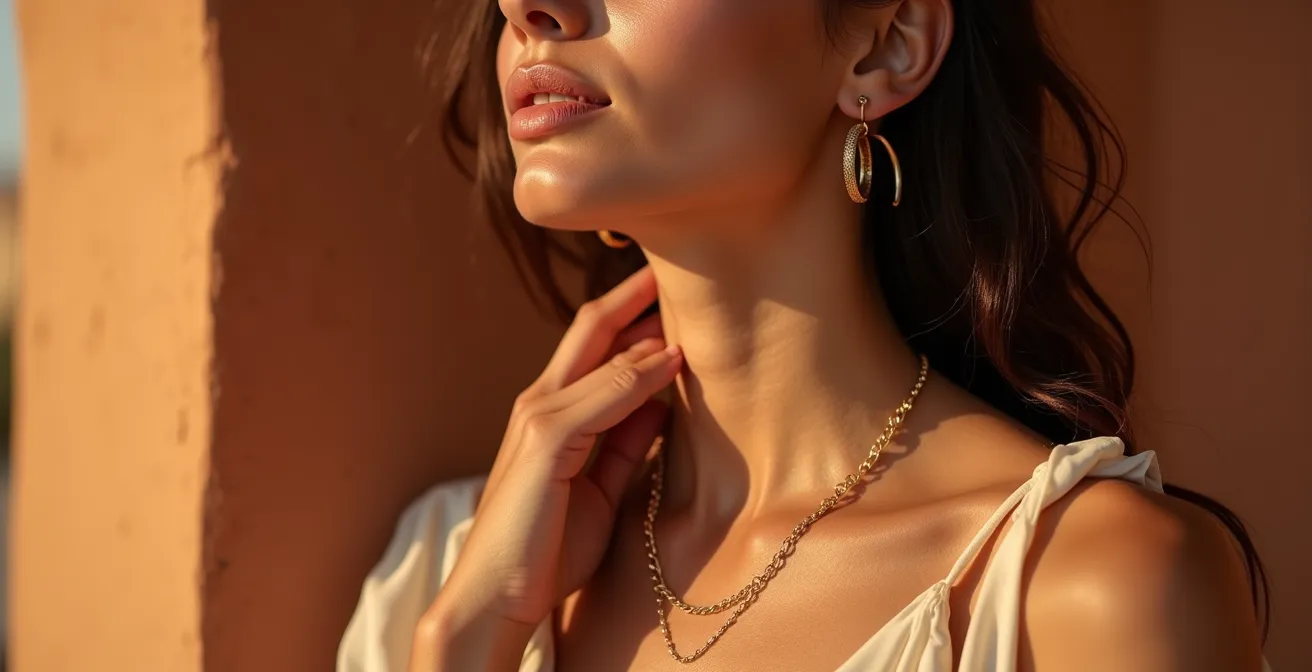 Esta perspectiva lo cambia todo. Ya no eliges un iluminador solo por su color, sino por cómo su partícula refleja la luz. No aplicas colorete para dar rubor, sino para crear un «lifting cromático» que eleve tus facciones y dé espacio visual a unos pendientes largos. En este artículo, no te daré trucos genéricos. Te enseñaré los secretos técnicos para que tu maquillaje y tus joyas trabajen en equipo, creando un look cohesivo donde cada elemento potencia al otro. Descubrirás cómo la elección de una base, la colocación milimétrica de un punto de luz o la textura de un colorete pueden transformar por completo la manera en que tus joyas brillan sobre tu piel.